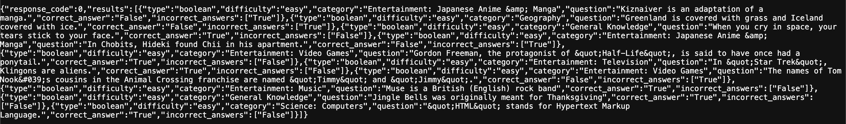 { "response_code": 0, "results": [ { "type": "boolean", "difficulty": "easy", "category": "Entertainment: Video Games", "question": "In Splatoon, the Squid Sisters are named Tako and Yaki.", "correct_answer": "False", "incorrect_answers": [ "True" ] }, { "type": "boolean", "difficulty": "easy", "category": "Entertainment: Japanese Anime & Manga", "question": "Kiznaiver is an adaptation of a manga.", "correct_answer": "False", "incorrect_answers": [ "True" ] }, { "type": "boolean", "difficulty": "easy", "category": "Sports", "question": "In Rugby League, performing a "40-20" is punished by a free kick for the opposing team.", "correct_answer": "False", "incorrect_answers": [ "True" ] }, { "type": "boolean", "difficulty": "easy", "category": "Entertainment: Books", "question": "Shub-Niggurath is a creature that was created by \tJ. R. R. Tolkien in his novel "The Lord of The Rings".", "correct_answer": "False", "incorrect_answers": [ "True" ] }, { "type": "boolean", "difficulty": "easy", "category": "Science: Mathematics", "question": "An isosceles triangle has two sides of equal length as opposed to three.", "correct_answer": "True", "incorrect_answers": [ "False" ] }, { "type": "boolean", "difficulty": "easy", "category": "Entertainment: Video Games", "question": "In RuneScape, one must complete the "Dragon Slayer" quest before equipping Rune Platelegs.", "correct_answer": "False", "incorrect_answers": [ "True" ] }, { "type": "boolean", "difficulty": "easy", "category": "Entertainment: Video Games", "question": "Watch_Dogs 2 is a prequel.", "correct_answer": "False", "incorrect_answers": [ "True" ] }, { "type": "boolean", "difficulty": "easy", "category": "Entertainment: Video Games", "question": "Peter Molyneux was the founder of Bullfrog Productions.", "correct_answer": "True", "incorrect_answers": [ "False" ] }, { "type": "boolean", "difficulty": "easy", "category": "History", "question": "The Spitfire originated from a racing plane.", "correct_answer": "True", "incorrect_answers": [ "False" ] }, { "type": "boolean", "difficulty": "easy", "category": "Animals", "question": "In 2016, the IUCN reclassified the status of Giant Pandas from endangered to vulnerable.", "correct_answer": "True", "incorrect_answers": [ "False" ] } ] }