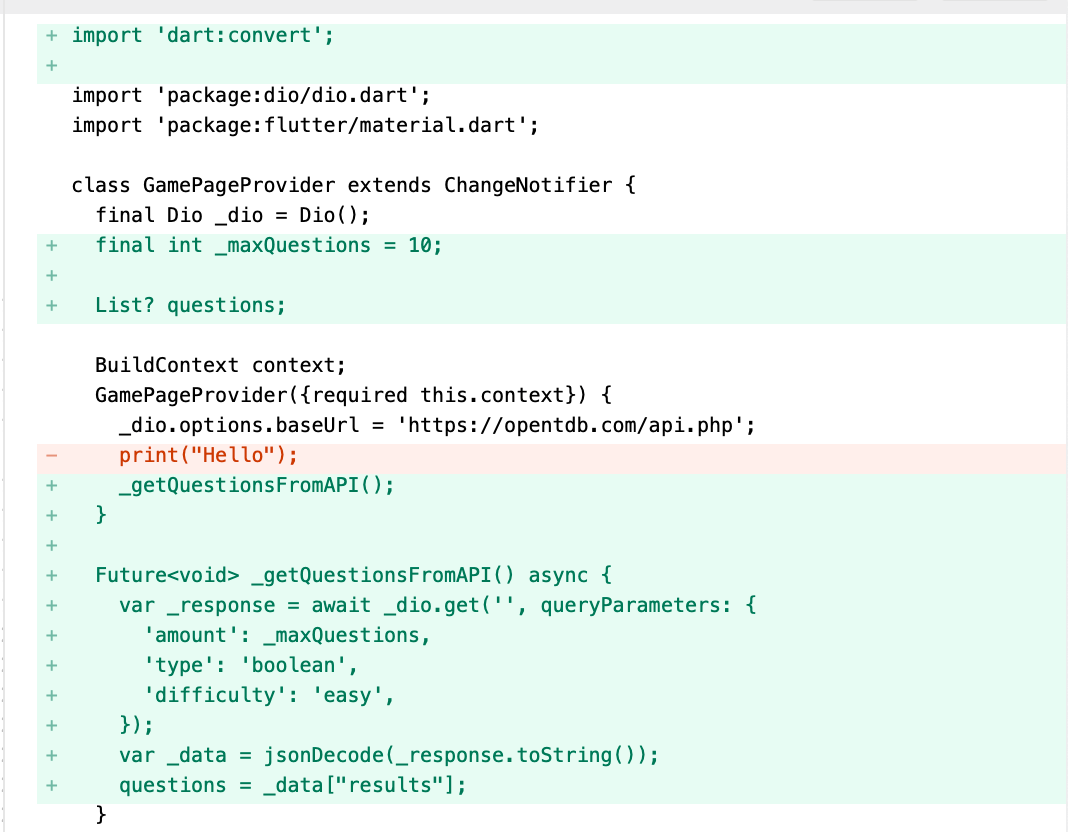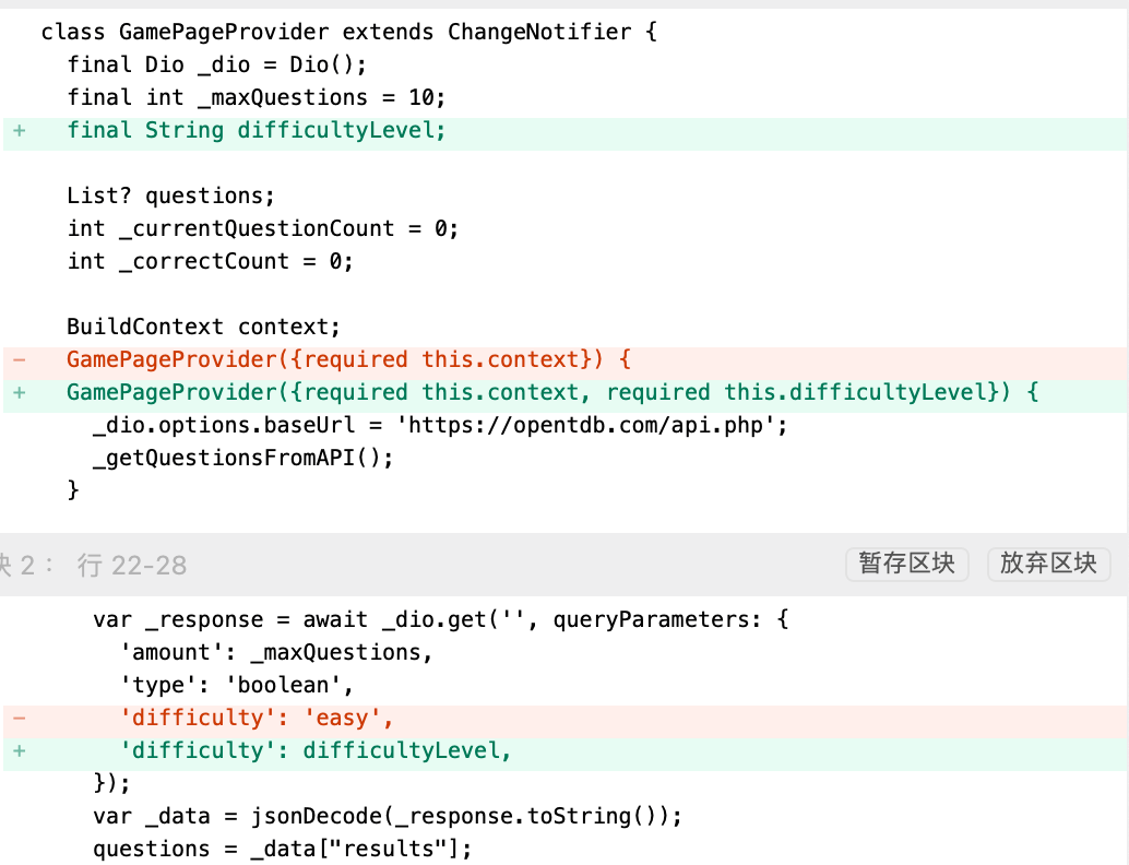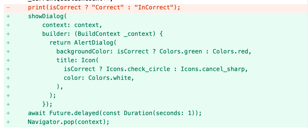 game_page_provider.dart中answerQuestion回答方法void answerQuestion(String _answer) async { bool isCorrect = questions![_currentQuestionCount]["correct_answer"] == _answer; _correctCount += isCorrect ? 1 : 0; _currentQuestionCount++; showDialog( context: context, builder: (BuildContext _context) { return AlertDialog( backgroundColor: isCorrect ? Colors.green : Colors.red, title: Icon( isCorrect ? Icons.check_circle : Icons.cancel_sharp, color: Colors.white, ), ); }); await Future.delayed(const Duration(seconds: 1)); Navigator.pop(context); if (_currentQuestionCount == _maxQuestions) { endGame(); } else { notifyListeners(); } } - 新增方法