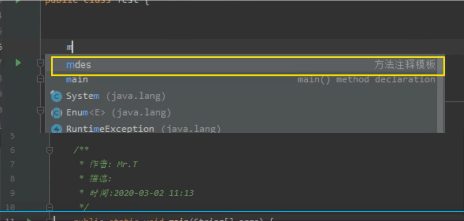代码模板是指,配置一些常用的代码字母缩写后,当输入缩写字母时,IDEA会根据输入的字母缩写,帮助自动完成预设的代码。从而提供编码效率,同时也可以进行个性化设置,例如:注释模板。