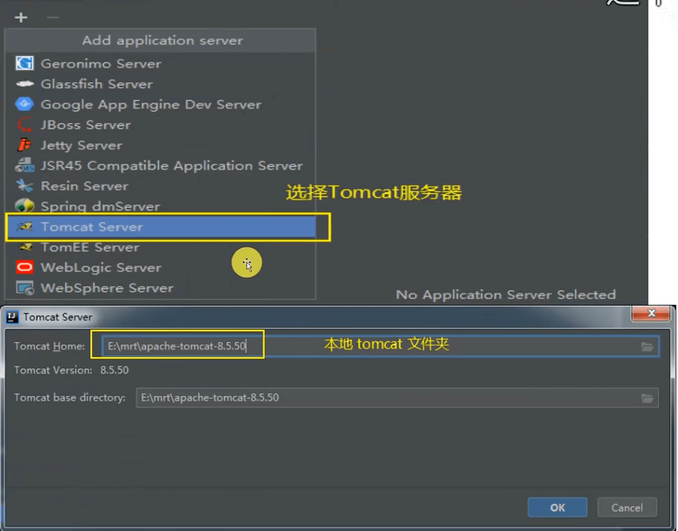 点击+,选择Tomcat Server,选择Tomcat根路径,点击OK