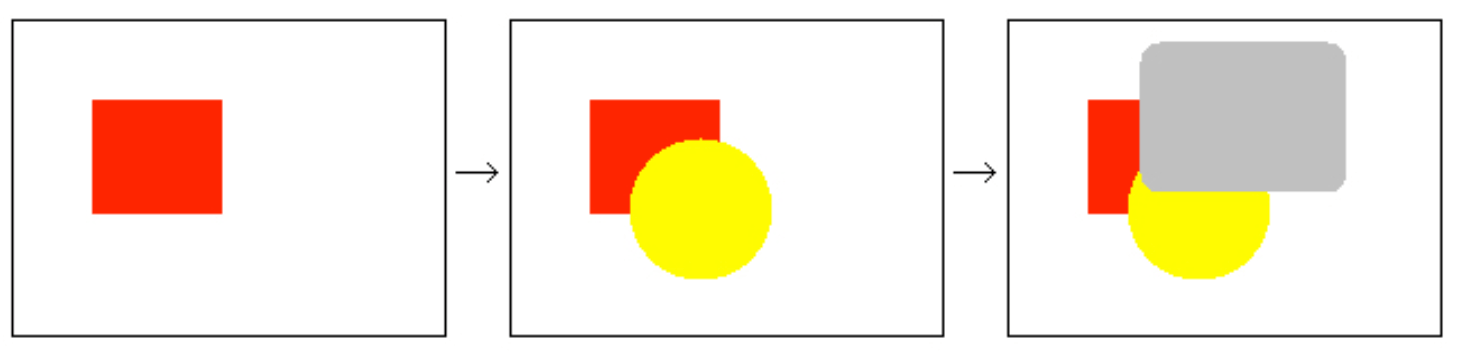 例如下⾯的图例:先绘制红⾊部分,再绘制⻩⾊部分,最后再绘制灰色部分,即可解决隐藏⾯消除的 问题。
