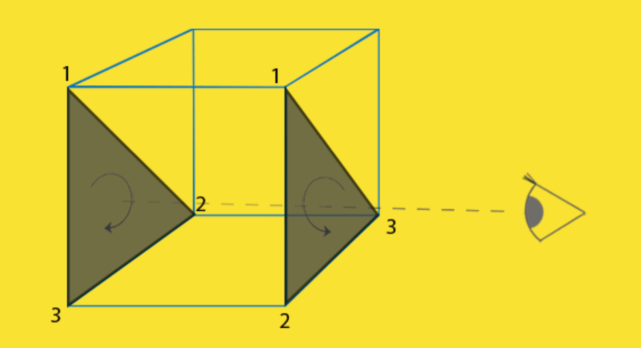 - 当观察者在右侧时,则右边的三⻆形⽅向为逆时针⽅方向判定为正⾯,⽽左侧的三⻆形为顺时针则为背面