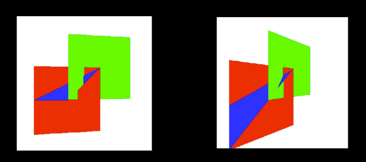 使⽤油画算法,只要将场景按照物理距离观察者的距离远近排序,由远及近的绘制即可.那么会出现什么问题? 如果三个三角形是叠加的情况,油画算法将⽆法处理.